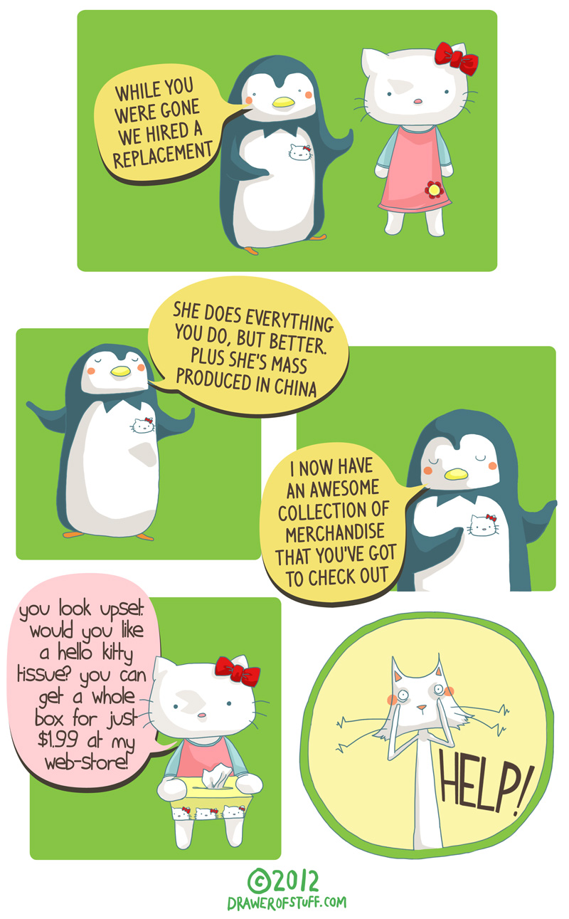 20120316comics Leave a comment the kitty nightmare continues share the love: Click to email a link to a friend (Opens in new window) Email Click to share on Facebook (Opens in new window) Facebook Click to share on X (Opens in new window) X Click to share on Tumblr (Opens in new window) Tumblr Click to share on Pinterest (Opens in new window) Pinterest Like Loading... Related catshello kittyjapanpenguins